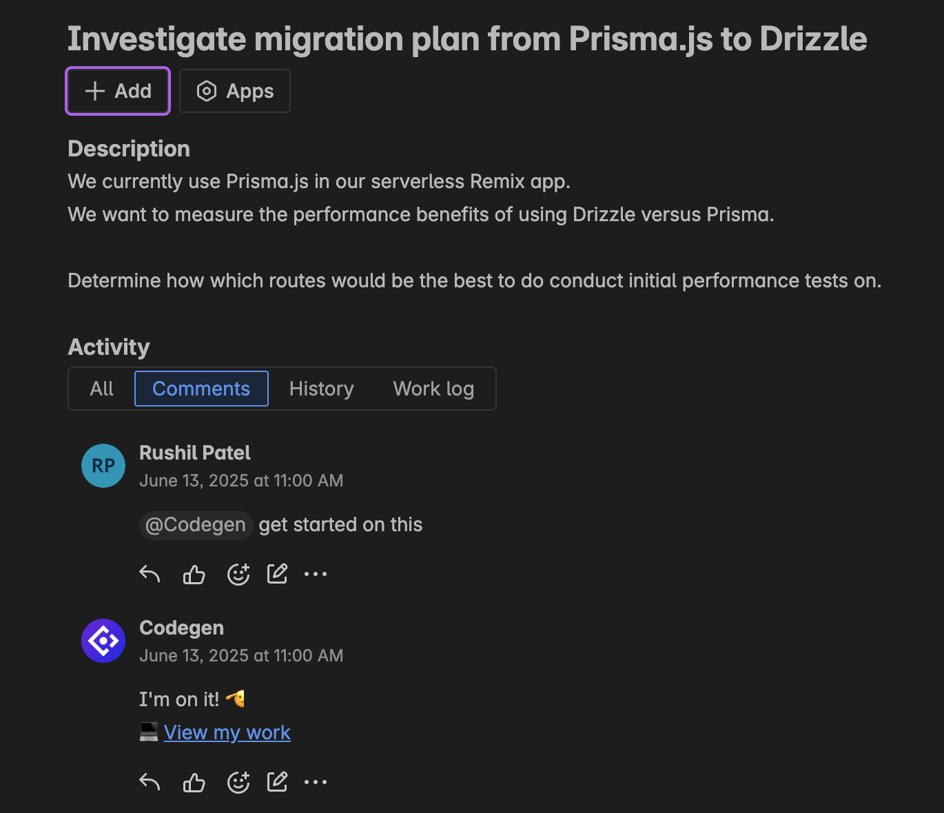• Codegen will interact with the ticket, update statuses, add comments, and link PRs as needed.